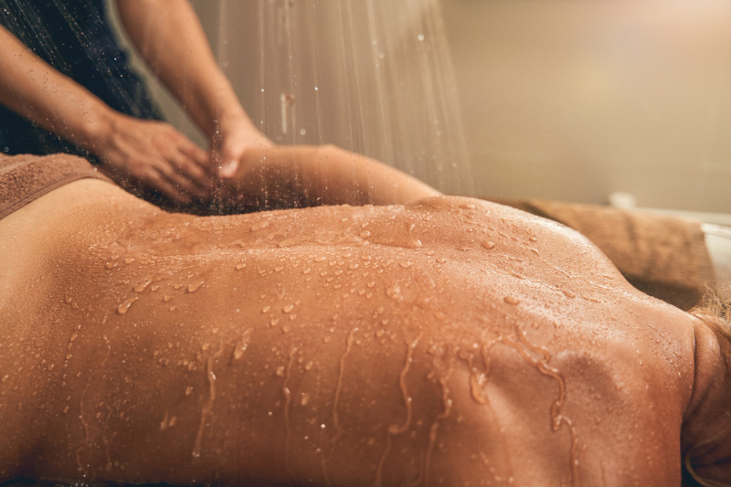 Le massage sous affusions se déroule en cabine spéciale. Vous êtes allongé sur une table de massage, au-dessus de vous, une douche à affusions qui pulvérise de fine pluie d’eau douce chauffée sur votre corps. Nous entamons alors un gommage exfoliant et nourrissant au coco où aux huiles essentielles de cèdre riches et boisées permettant de se régénérer de la fatigue et de s'ancrer tout en boostant l'énergie.  Cette association du massage avec l'eau apporte une sensation de relaxation douce et profonde et entraîne un relâchement musculaire.